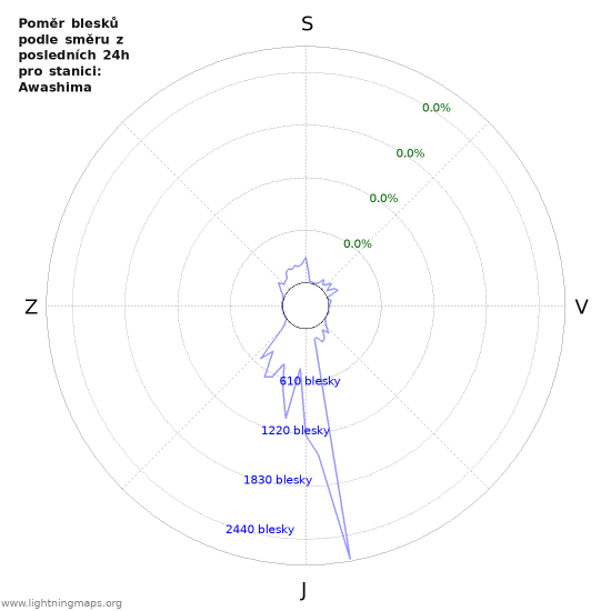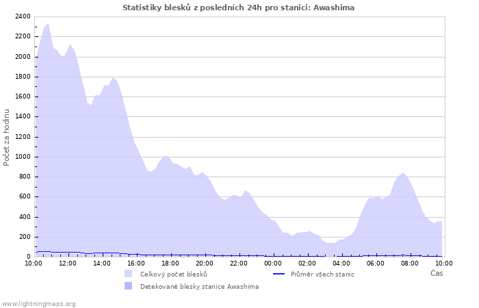 Zde najdete celkový počet blesků za hodinu detekovaný v celé síti, počet blesků za hodinu ze stanice Awashima a průměrný počet blesků ze všech stanic.