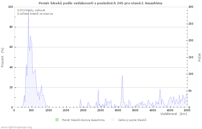 Přehled vlastního lokalizačního poměru ke vzdálenosti od stanic. Celkový počet blesků na vzdálenost je také zobrazen.