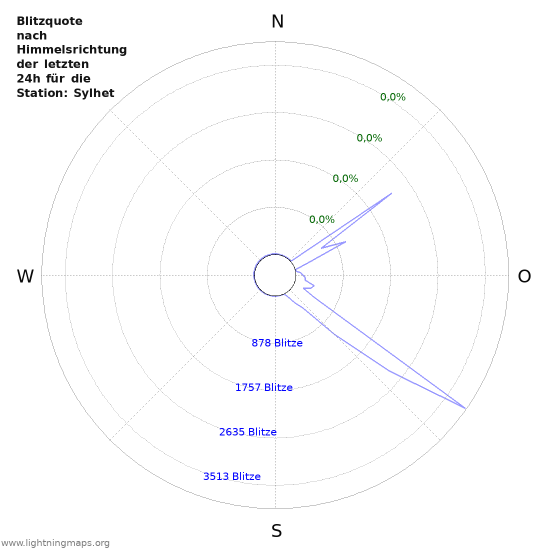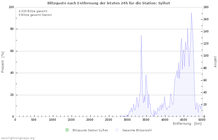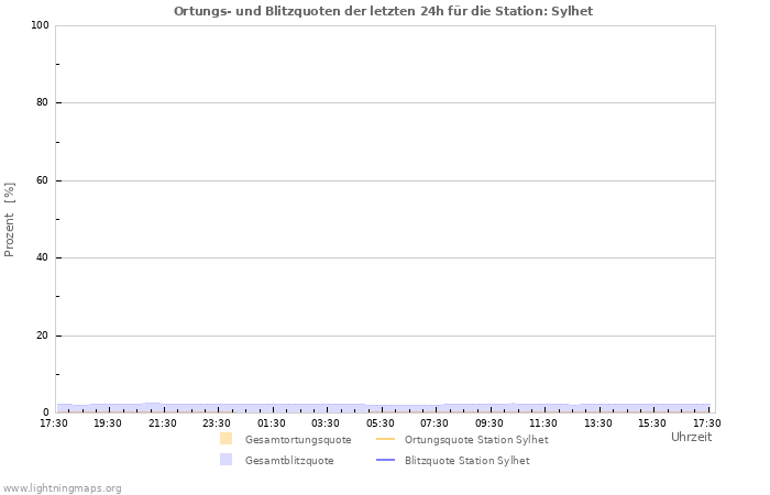 Zu sehen ist die Gesamtanzahl an Blitzen pro Stunde aus dem Ortungsnetzwerk, die Anzahl der detektierten Blitze der Station Sylhet sowie zum Vergleich der Durchschnitt aller Stationen.