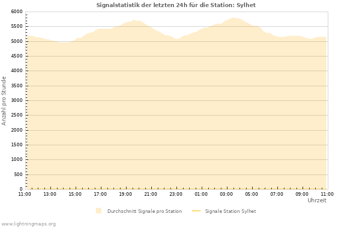 Die Anzahl der empfangenen Signale pro Stunde der Station Sylhet sowie zum Vergleich der Durchschnitt aller Stationen.