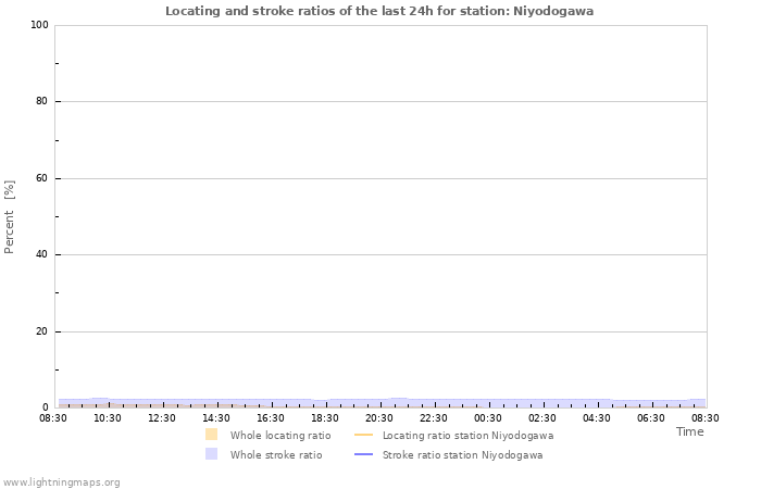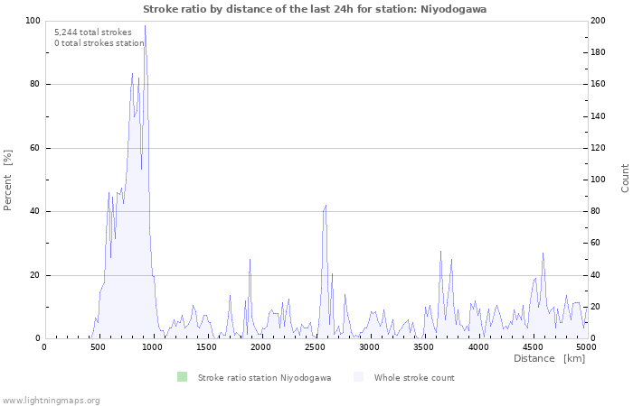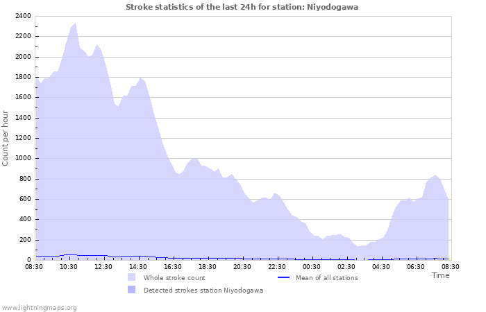 Here you can see the whole stroke count per hours detected by the lightning network, the count of detected strokes/h of the station Niyodogawa and the mean stroke count for all stations