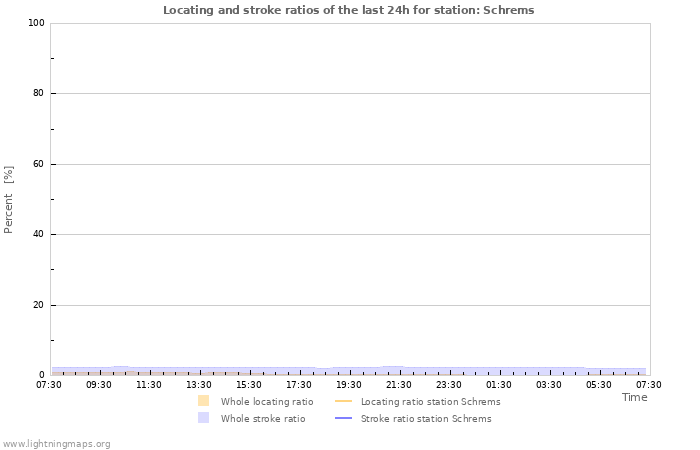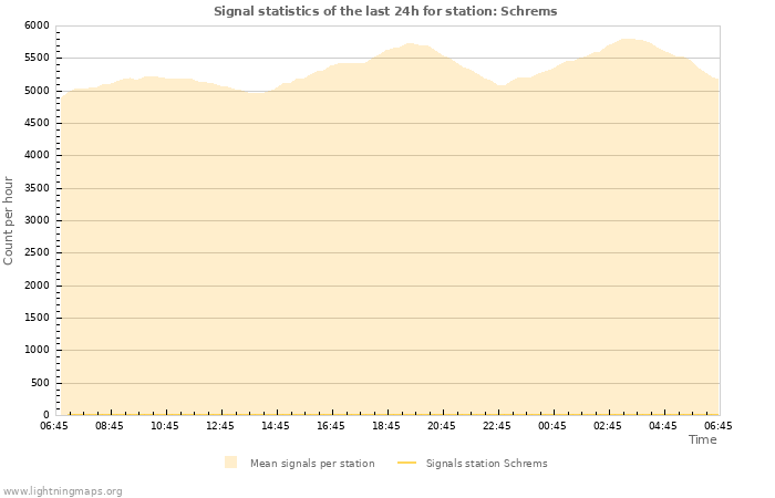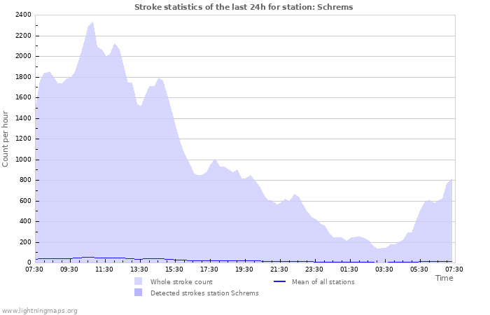 Here you can see the whole stroke count per hours detected by the lightning network, the count of detected strokes/h of the station Schrems and the mean stroke count for all stations