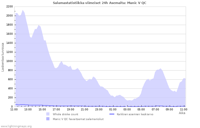 Here you can see the whole stroke count per hours detected by the lightning network, the count of detected strokes/h of the station Manic V QC and the mean stroke count for all stations