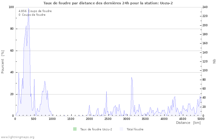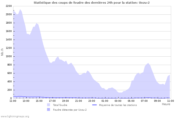 Ici vous pouvez voir la totalité des coups de foudre comptabilisés par le réseau Blitzortung, la quantité de coups de foudre par heure de la station Uozu-2 ainsi que qté moyenne des coups foudre de toutes les autres stations