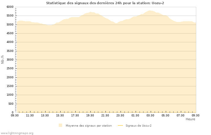 Le nombre de signaux reçus par heure par la station de Uozu-2 ainsi que la moyenne des autres stations.