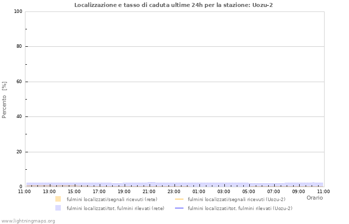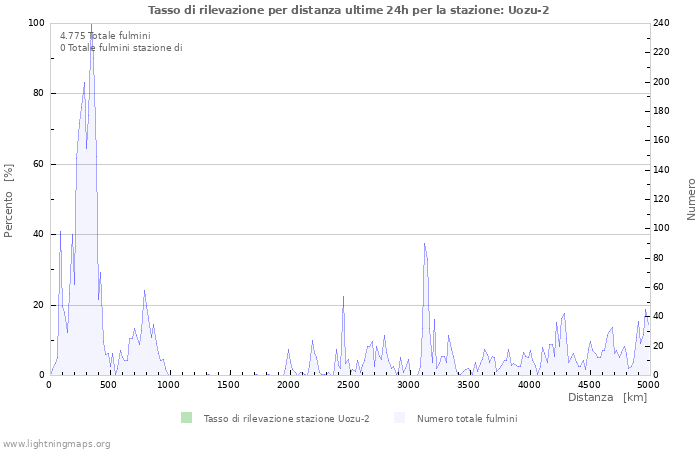 Il grafico riporta il totale delle fulminazioni per ora dell'intera rete, e della stazione di Uozu-2.
