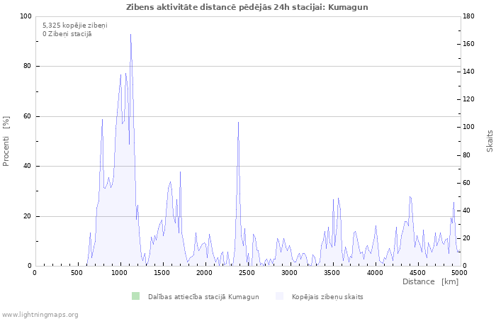 Pārskats par lokalizācijas attiecību pret attālumu no stacijas. Kopējais zibeņu skaits distancēs arī ir parādīts.