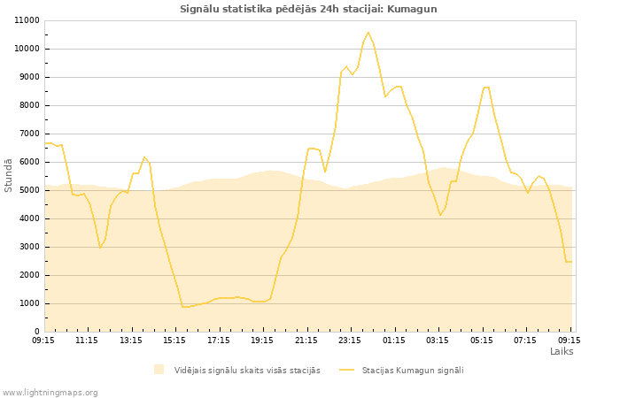 Vienā stundā saņemto signālu skaits stacijā Kumagun, kā arī vidējā vērtība visās stacijās.