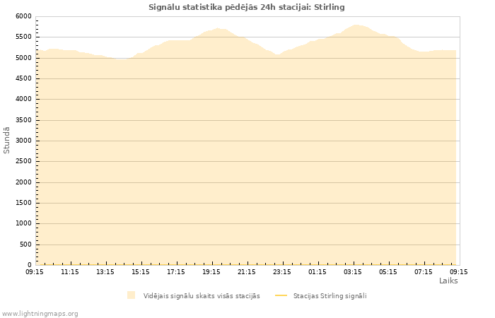 Vienā stundā saņemto signālu skaits stacijā Stirling, kā arī vidējā vērtība visās stacijās.