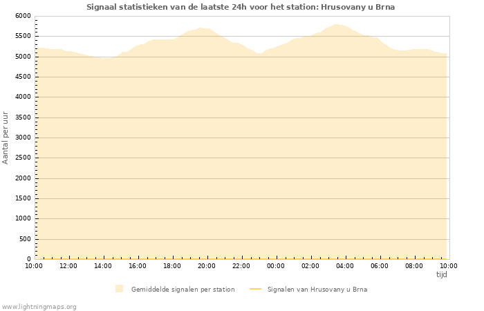 Het aantal ontvangen signalen per uur van station Hrusovany u Brna en de gemiddelde waarde van alle stations.