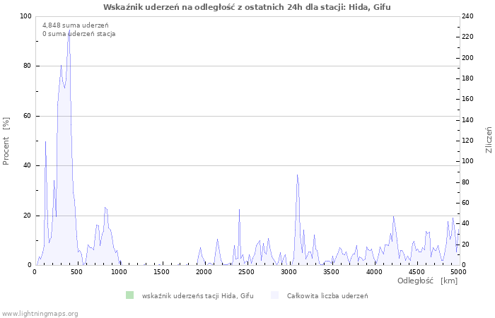 Przegląd własnego wkaźnika lokalizacji od stacji. Całkowita liczba uderzeń od odległości także jest widoczna