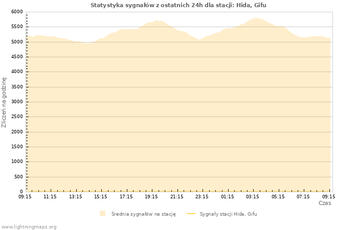 Liczba odebranych sygnałów na godzinę ze stacji Hida, Gifu a także średnia ze wszystkich stacji