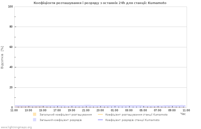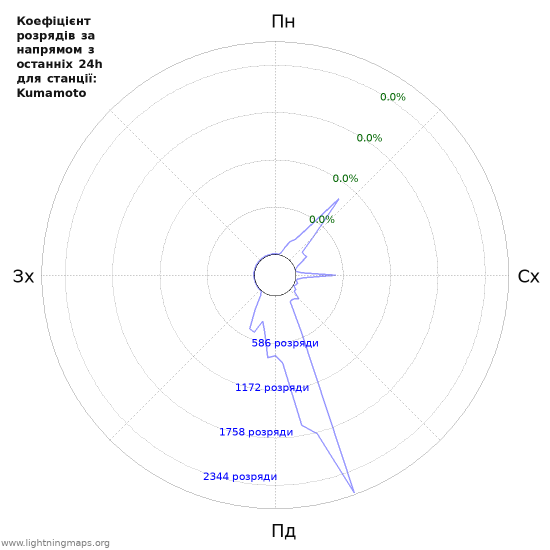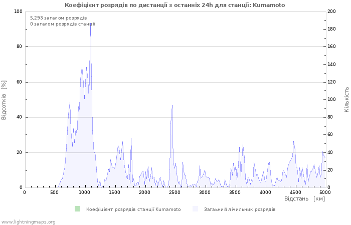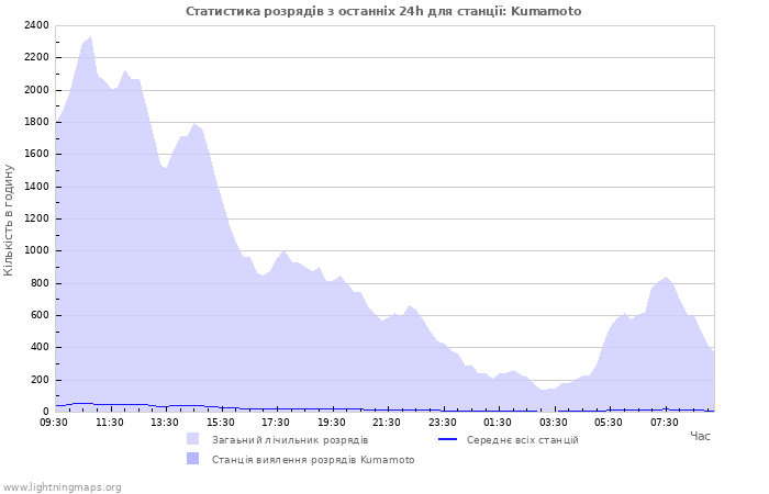 Тут ви можете побачити загалну кількість розрядів за кілька годин виявлених у мережі блискавок, кількість виявлених розрядів на годину станції Kumamoto і середня кількість розрядів для всіх станцій